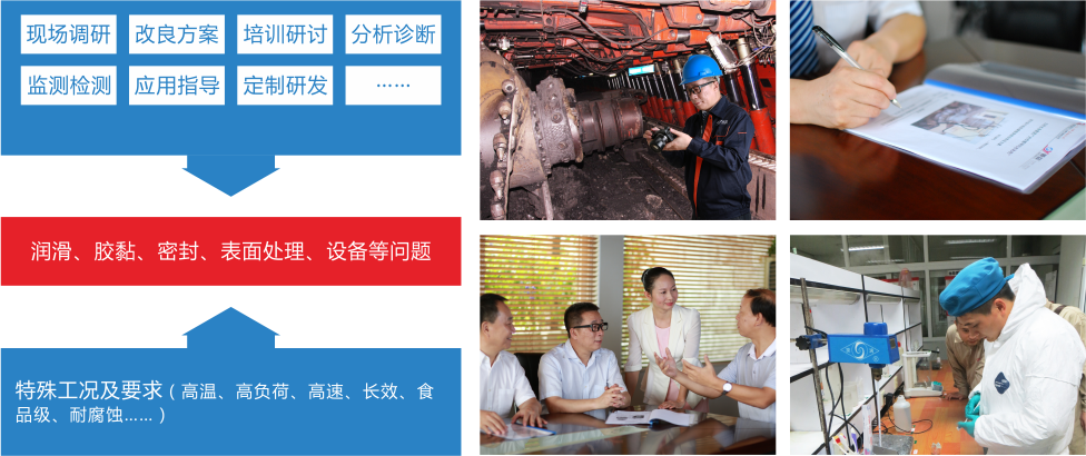 在潤滑、膠粘、密封、表面處理等領域,我們一直致力于“為企業提供合理潤滑密封集成系統解決方案”,通過現場調研、診斷分析、改良方案、培訓講座、專題研討、應用指導等“專科醫生式”的服務模式,協助企業解決潤滑、密封等領域的“疑難雜癥”,從而保障設備運行,降低生產成本,提升產品品質,提高綜合經濟效益,為社會節能降耗。